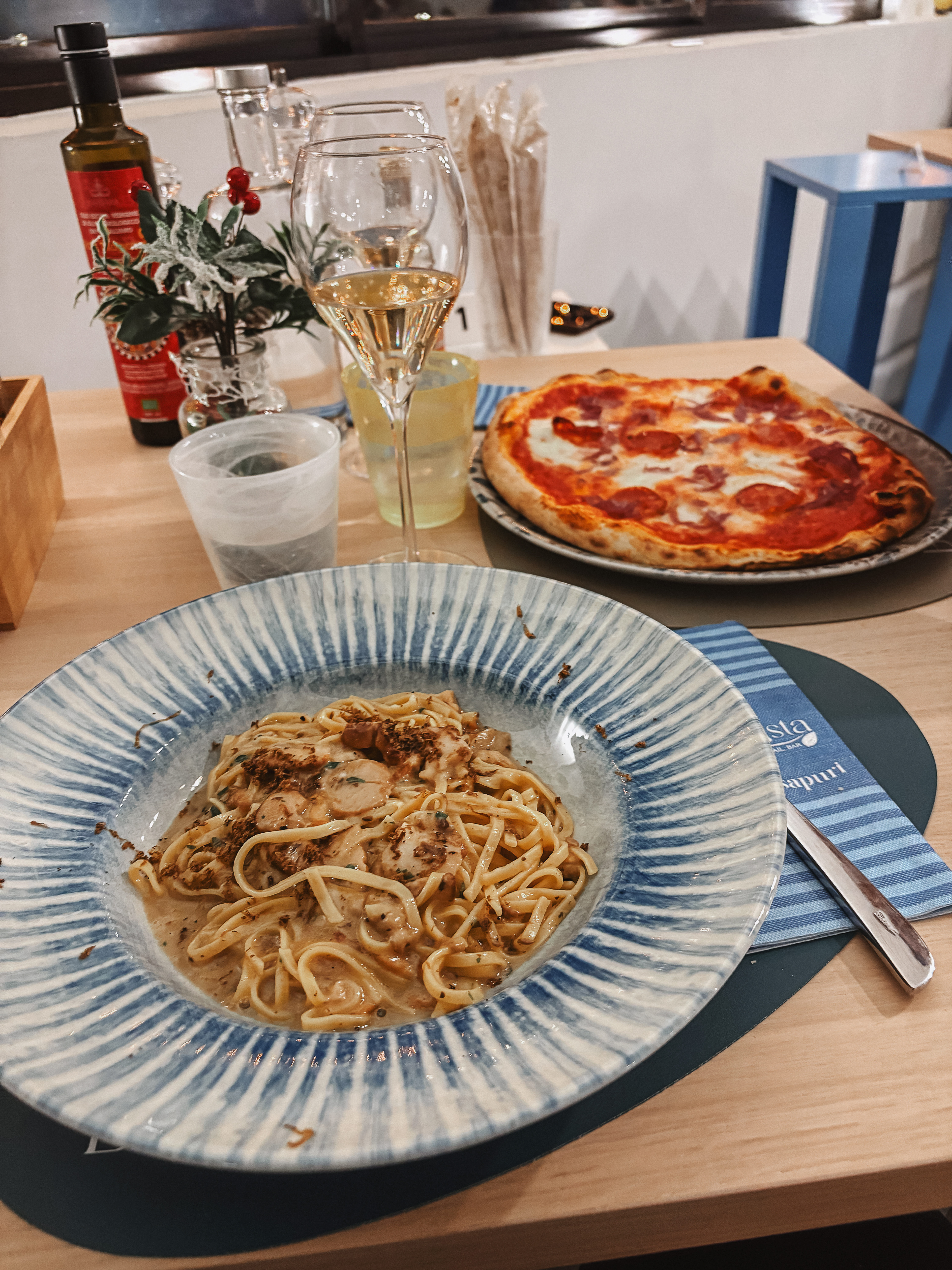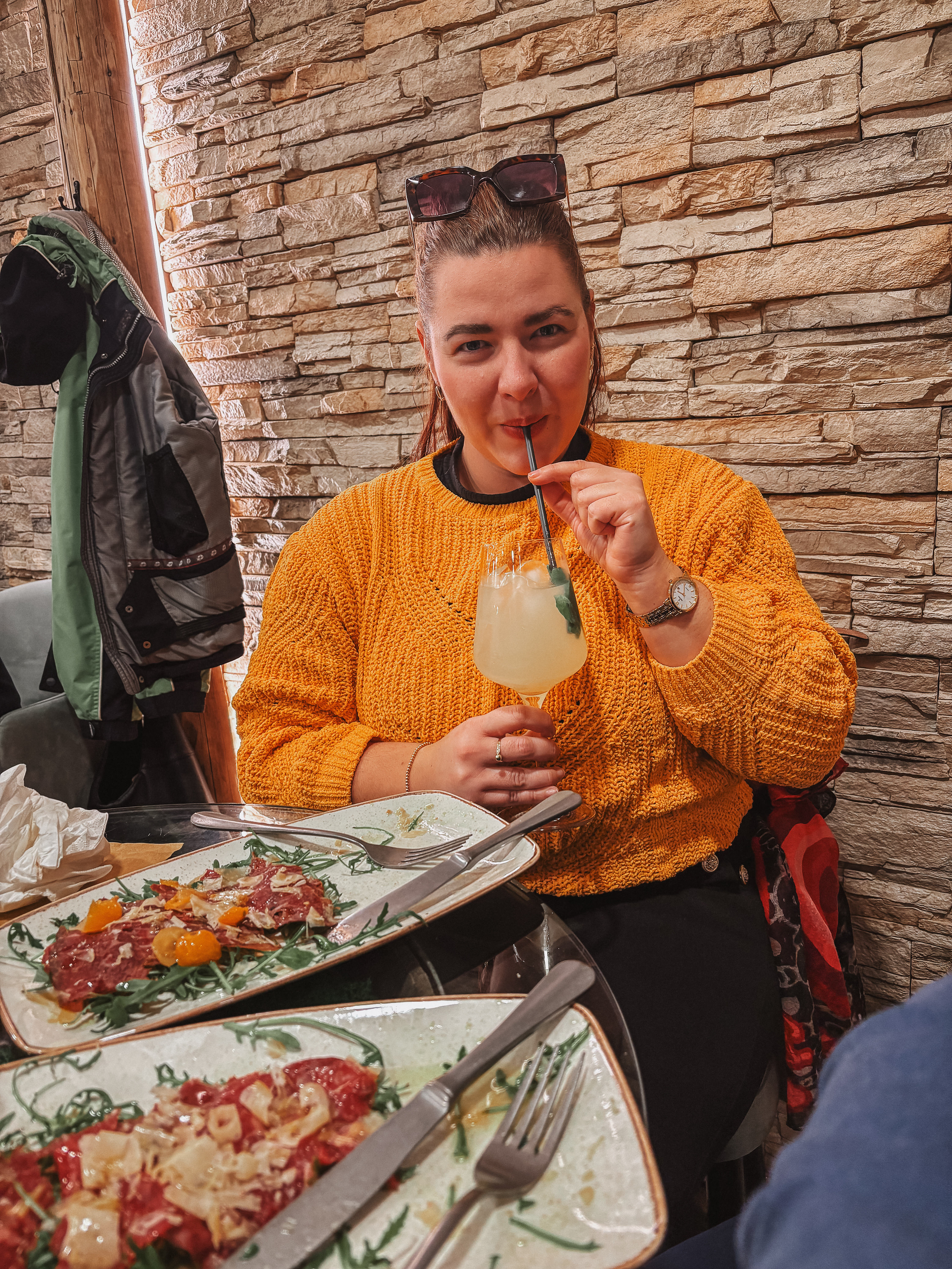 Po příjezdu do Rivy to bylo trochu komplikovanější s naleznutím parkoviště, ale nějak se nám to nakonec povedlo, bohužel za cenu pokuty 😁 Tohle město působilo velice autenticky - bylo plné Italů, kteří se v sobotu dopoledne potkávali na vánočních trzích se skleničkou vína v ruce, nikdo nikam nespěchal a v kombinaci s výhledem na jezero a hory to nemělo chybu. Po procházce jsme si sedli na břeh v parku u jezera a prostě jen tak byli. S gastro zážitkem nám pomohli Google recenze a vinotéka (bistro) Antica Cantina s hodnocením 4,9 hvězdiček, kde jsme ochutnali několik druhů carpaccia a Limone Spritz (Limoncello s prossecem), což Marci trošku přiopilo už v době oběda.