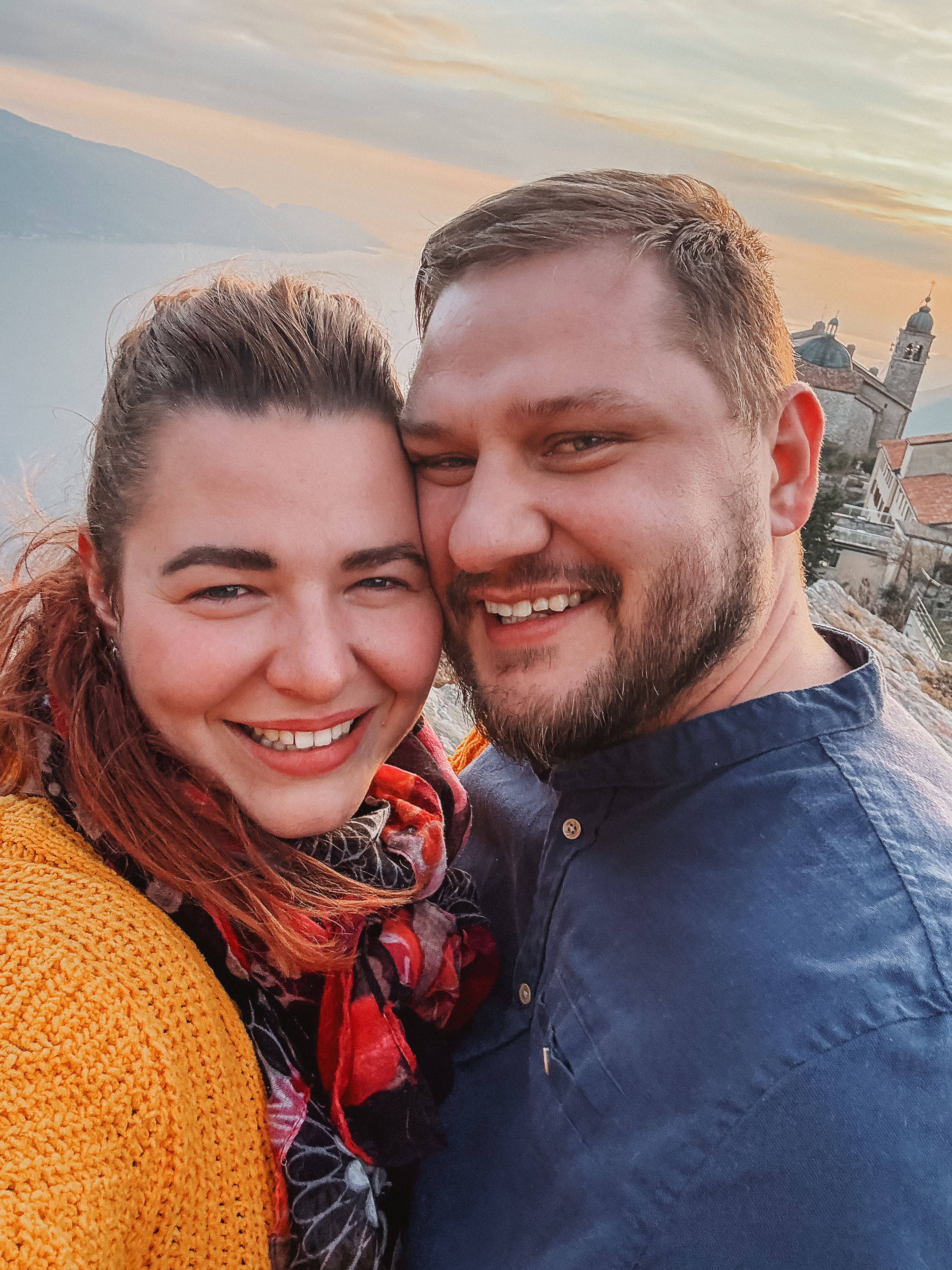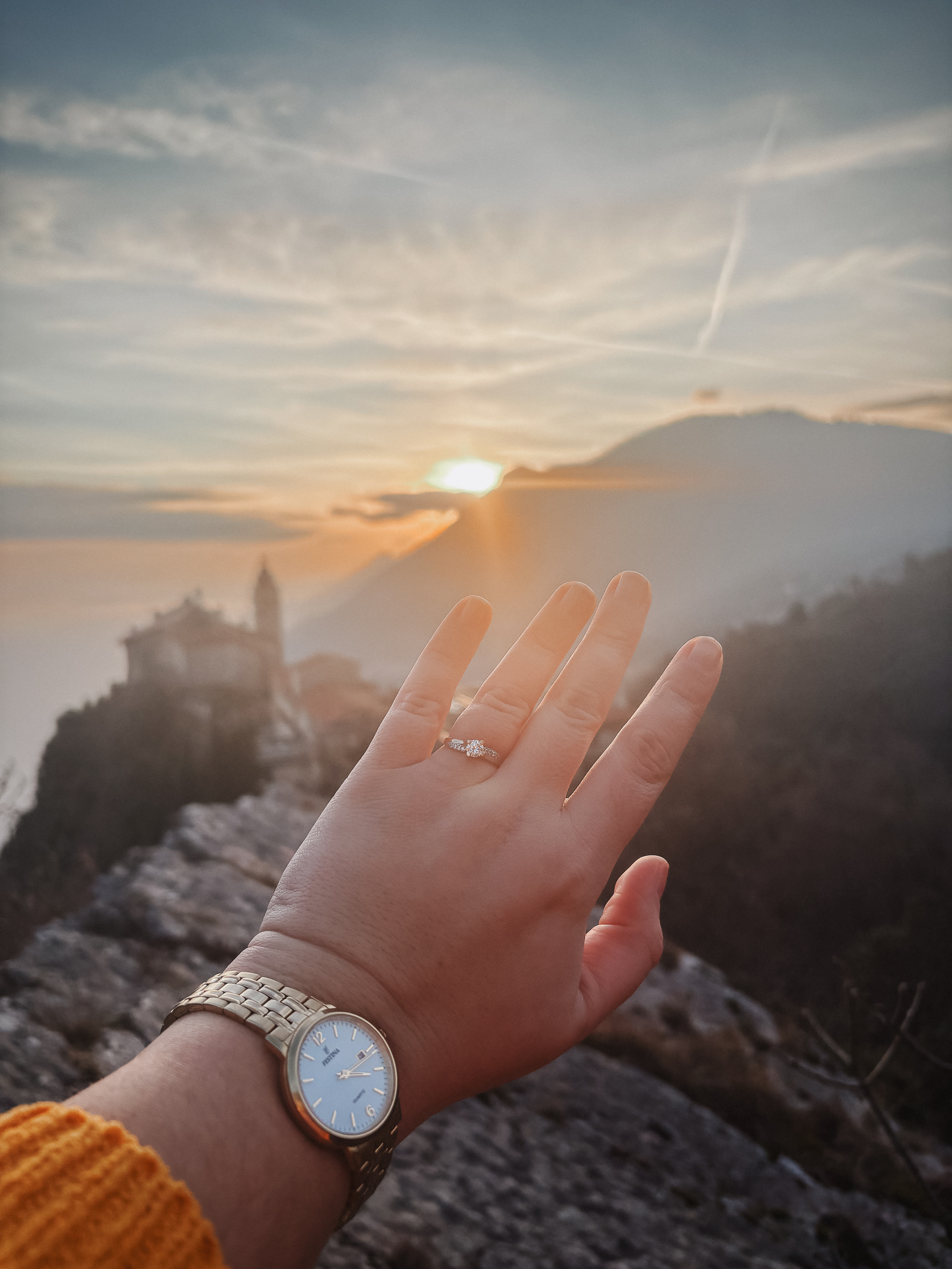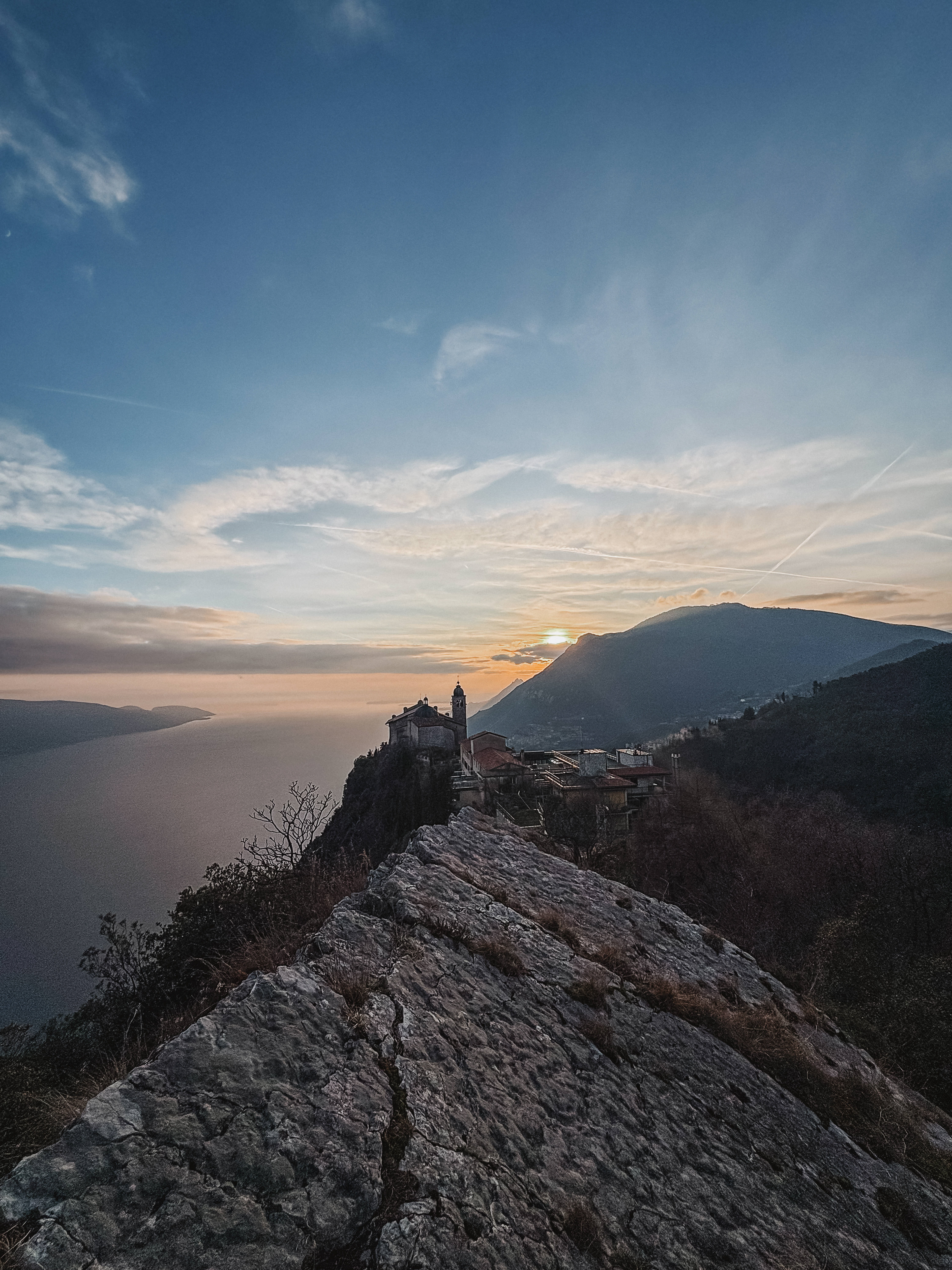 Cestou zpátky Ondřej působil značně nervózně a zběsile hledal v Google mapách dokonalou vyhlídku. Nakonec jsme zastavili u kláštera na kopci Santuario di Montecastello, ke kterému jsme vyjeli až nahoru autem. Od kláštera jsme na kopec vyrazili pěšky, už to byl vážně kousek. Výhled i západ slunce byl excelentní. Byla to taková krásná romantická chvíle.